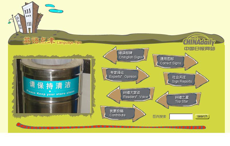 China Daily promoting the fight against everything Chinglish. The site offers many Chinglish examples as well as correct translations and expert opinions. It also diligently collects nationwide reports on the Chinglish phenomenon (or rather a selection of success stories of the fight against it).